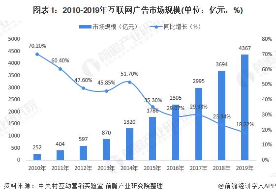 根据《中国互联网广告发展报告》数据显示,2010-2019年我国互联网广告市场呈现出逐年上升的发展趋势,增速呈现下降趋势。2019年我国互联网广告总收入约4367亿元人民币,相较上年增长18.22%,增幅较2018年略有放缓,但仍保持增长的态势。