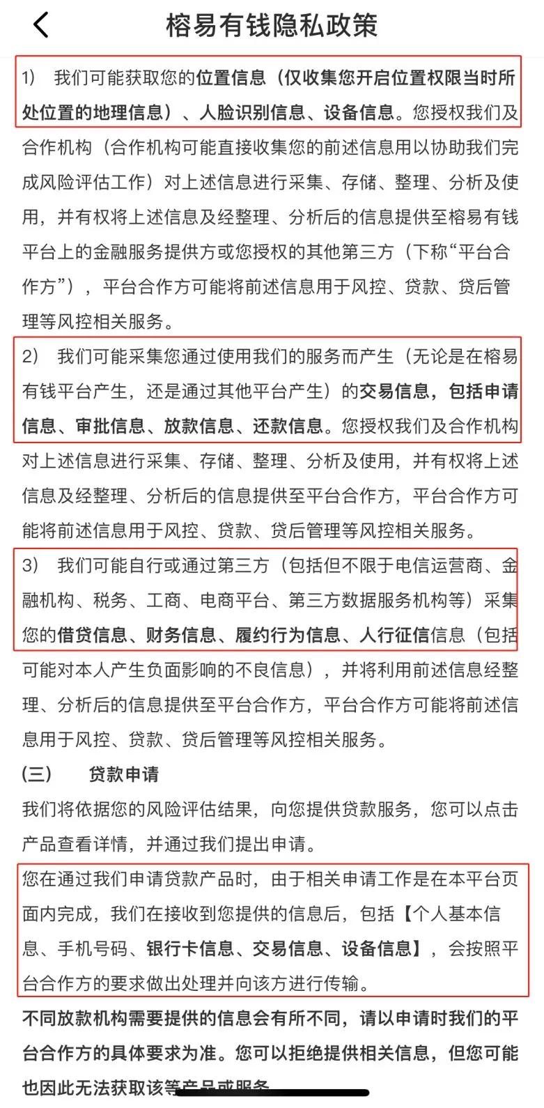 而从收集的信息类别来看,榕易有钱显然也违背了“收集个人信息应遵循最少够用”原则。
