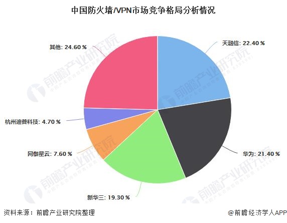 目前,国内防火墙市场格局方面,天融信处于市场领先地位,占据22.40%的份额;其次是华为,占比为21.40%;新华三排名第三,占比为19.30%;网御星云和杭州迪普科技分别占据7.60%和4.70%的市场份额。