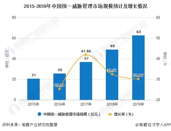 与全球市场相比,我国UTM的市场空间十分巨大,吸引了国外厂商积极参与到中国的UTM市场竞争中来。目前,已经或准备在国内推出UTM产品的厂商有十几家,国外厂商中有Fortinet、Crossbeam、Watch Guard等;国内厂商有启明星辰、联想网御、安氏领信等。根据统计数据,2019年我国统一威胁管理市场占比约为10%,规模约为63亿元。