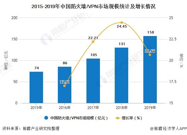 防火墙/VPN市场可以说是中国IT安全市场的中流砥柱,客户对于该类产品的认知度和接受度都较高,成熟厂商较多。多年来,防火墙/VPN市场保持稳步较快的发展态势。2015-2019年,中国防火墙/VPN整体市场规模年复合增长率约为21%,2019年市场规模达到158亿元。