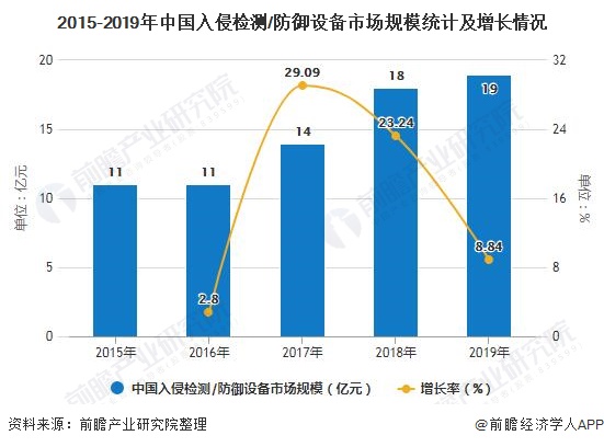 从IDS/IPS(入侵检测/防御)市场中的份额来看,硬件占了IDS/IPS的主要部分,比例约为45%,其次是基于托管的IDS/ISP,市场份额约为31%,基于网络的软件占市场份额的24%。随着市场的发展,基于网络的IDS/IPS软件增长速度越来越快。根据Gartner网络安全行业产品结构比例分布,2019年,我国入侵检测/防御设备市场规模约为19亿元。