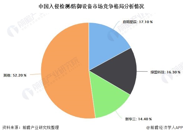 近几年,国内IDS/IPS市场集中度逐步提高,市场主要以启明星辰、绿盟科技和新华三为主要竞争力量,其市场占有率分别为17.10%、16.30%和14.40%。