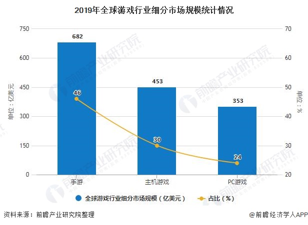 目前,游戏市场大致分为手游、PC游戏以及主机游戏。受到智能手机、平板电脑等便携式智能设备的发展,手游市场得到快速发展,占据游戏行业近五成份额。根据Newzoo数据显示,2019年,全球手游市场规模已达到682亿美元,占比高达46%。前瞻分析,由于2020年中国武汉新冠病毒的爆发,春节期间娱乐游戏市场得到快速发展,中国游戏市场将拉动2020年全球手游市场的发展。