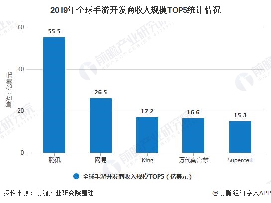 从游戏开发商的层面来看,2019年全球手游开发商TOP5分别为腾讯、网易、King、万代南梦宫以及Supercell。其中腾讯凭借王者荣耀以及和平精英两大手游市场,居于全球各大游戏开发商首位。2019年1-10月,其收入规模达到55.5亿美元。