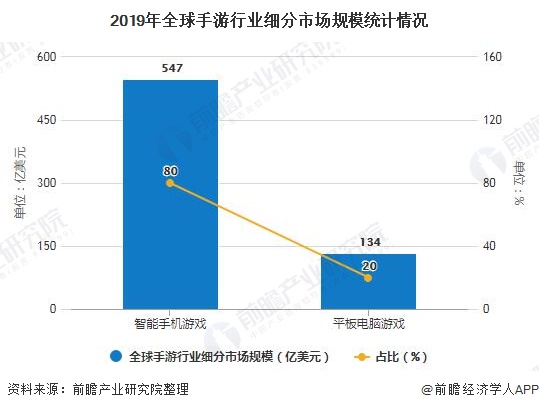 从全球手游市场的细分结构来看,2019年,智能手机游戏市场规模达到547亿美元,占手游市场的80%,平板电脑的市场份额仅占20%;可以看出,智能手机游戏市场成为手游市场的主要拉动力。