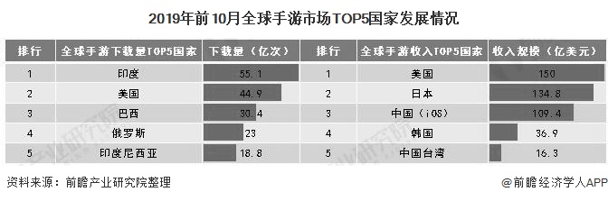 根据Sensor Tower的数据显示,2019年1-10月,全球手游下载量前五的国家分别为印度、美国、巴西、俄罗斯以及印度尼西亚,其中印度成为全球手游下载量第一国家,其下载量达到55.1亿次;而从手游收入的层面来看,美国为全球手游市场收入第一国家,达到150亿美元。