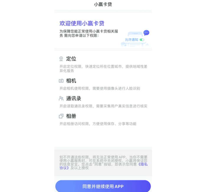 此外,小赢旗下信用卡代还平台小赢卡贷遭质疑导流714高炮,被投诉平台包括丰巢易借、小花速贷、江湖钱包等。打开小赢卡贷应用发现,其现在要求用户开通包括定位、相机、通讯录、相册等信息权限才能使用该应用,未显示直接导流产品,借款平台所属小赢易贷。