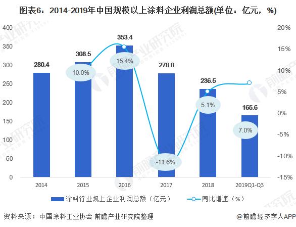 从企业盈利情况来看,除了2017年外,规上企业盈利能力有所上升。2019年前三季度,中国涂料行业规上企业实现利润总额为165.6亿元,同比增长7.0%。