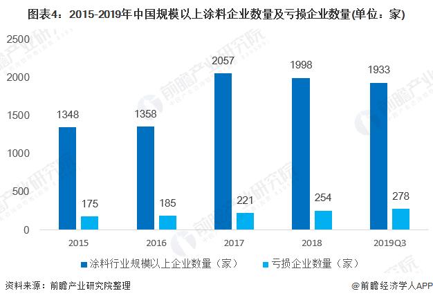 2018年,中国规上涂料企业数量为1998家,较上年减少59家;2019年第三季度,行业规上企业数量下降至1933家。