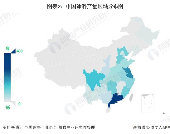 中国涂料产量主要集中与华东和中南地区。其中广东、上海、江苏涂料2018年产量分别为394.28万吨、200.10万吨和192.09万吨,占全国涂料产量的比重分别为22.4%、11.4%和10.9%,位列前三。