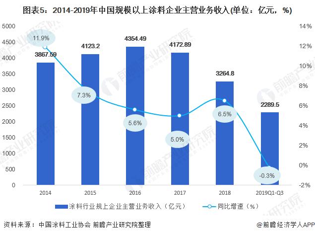 2019年前三季度,中国涂料行业规上企业主营业务营收2289.5亿元,同比小幅下降0.3%。