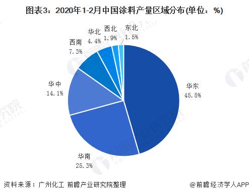 根据广州化工数据,2020年1-2月,华东、华南、华中三个地区涂料产量占比分别为45.5%、25.3%和14.1%;产量排名前三广东、上海、江苏地区,涂料产量占全国的49%左右。