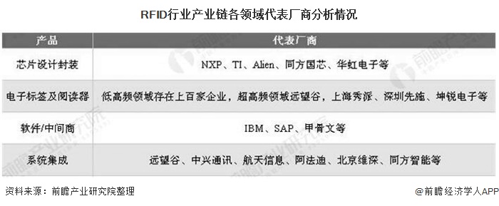 从行业竞争情况来看,目前国内企业在电子标签产业链封装、测试和系统集成环节具有较强的竞争优势。而在芯片设计封装、软件/中间商则主要由国外厂商掌控,其中芯片设计封装主要厂商包括NXP、TI、Impinj等;软件中间件则由IBM、微软、甲骨文等少数软件厂商垄断。