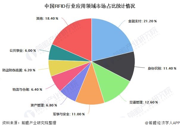下图所示为目前我国RFID在各个领域的应用市场占比情况,可以看出,金融支付占据21.2%的市场,成为了中国RFID行业市场第一板块。其次在身份识别、交通管理和军事与安全的应用也占据了10%以上的市场份额。