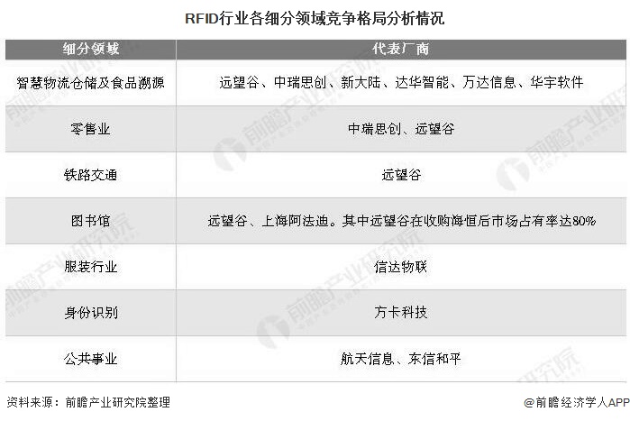 从各个细分应用市场来看,智慧物流仓储及食品溯源领域的代表企业有远望谷、中瑞思创、新大陆、达华智能、万达信息、华宇软件等;零售业领域的代表厂商有中瑞思创、远望谷等;在图书馆系统领域,远望谷收购海恒后,其市场占有率达80%。