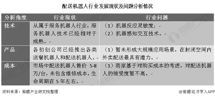 从配送机器人的行业分析来看,配送机器人作为服务机器人的子行业,技术和产业链相较完善,已经跨出了试验和研发阶段。现存在的主要问题是销售,即向B端客户(商家)的推广存在受阻,其次才是技术发展的多样性问题。