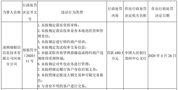 具体来看,瑞银信河南分公司存在如下违法违规事实:未按规定落实资质审核;未按规定落实收单业务本地化经营和管理责任;未按规定进行特约商户培训;未按规定发送收单交易信息;未能采取有效管理措施造成特约商户违规使用受理终端。