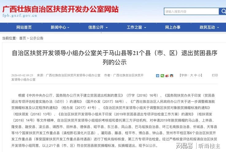 根据《中共中央办公厅、国务院办公厅关于建立贫困退出机制的意见》(厅字〔2016〕16号)、《国务院扶贫办关于印发〈贫困县退出专项评估检查实施办法(试行)〉的通知》(国开办发〔2017〕56号)、《广西壮族自治区人民政府办公厅关于进一步调整精准脱贫摘帽标准及认定程序的通知》(桂办发〔2017〕41号)、《自治区扶贫开发领导小组关于调整我区扶贫对象脱贫摘帽标准的通知》(桂扶领发〔2018〕13号)、《自治区扶贫开发领导小组关于印发〈2019年贫困县退出专项评估检查工作方案〉的通知》(桂扶领发〔2019〕14号)等文件精神,自治区扶贫开发领导小组组织考核组和委托第三方评估机构,对申请2019年脱贫摘帽的马山县、上林县、隆安县、融安县、凌云县、靖西市、田林县、德保县、昭平县、东兰县、凤山县、巴马瑶族自治县、环江毛南族自治县、忻城县、天等县等15个国家扶贫开发工作重点县(滇桂黔石漠化片区县),灌阳县、藤县、桂平市、博白县、钟山县、贺州市平桂区等6个自治区扶贫开发工作重点县(享受国家扶贫开发工作重点县待遇县)进行了相关指标核查、第三方专项评估检查。经过严格核查评估和报请自治区扶贫开发领导小组同意,以上21个县(市、区)符合贫困县脱贫摘帽标准,拟摘帽退出,现予以公示。