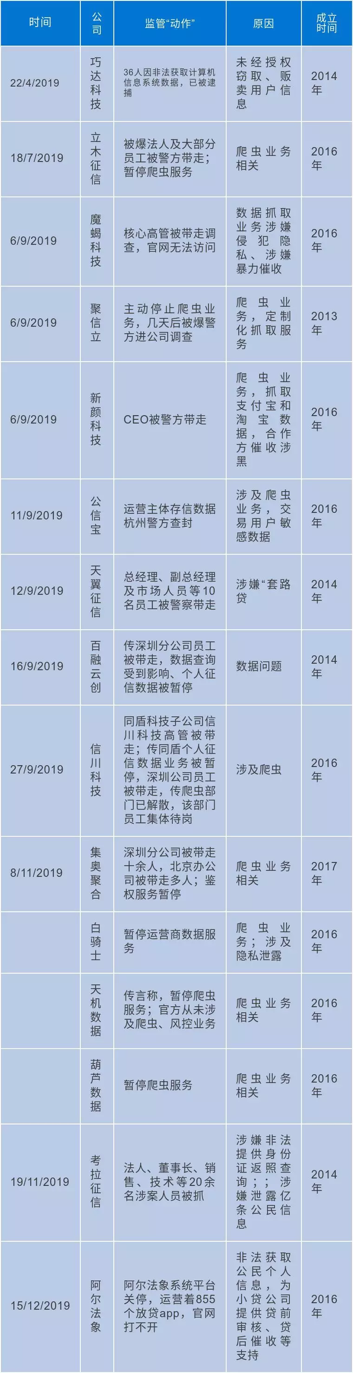 9 月 6 日,大数据智能风控服务供应商魔蝎数据被警方调查,一位核心高管被带走,官网至今无法正常访问;另一家大数据公司新颜科技的 CEO 黄向前也在同一天被警方带走调查;这天,聚信立发通知主动停止了爬虫业务,然未能幸免于“难“,仅过了几天后,聚信立被爆有警方进驻公司调查;9 月 11 日,知名币圈项目公信宝运营主体被杭州警方查封;次日,有媒体报道,集奥聚合深圳分公司十余人被带走,北京办公室也有多人被深圳警方带走;另有爆料称,天翼征信的总经理、副总经理及市场人员被警察带走。