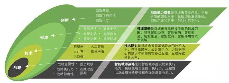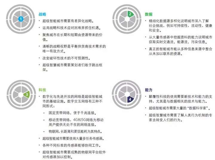 超级智能城市2.0超级智能城市可从四方面进行评量: 第一, 政府的战略规划, 反映政府发展智慧城市的意愿;第二,是否有足够的技术基础支撑智慧城市建设;第三, 智慧城市理念已经渗透的领域, 反映发展的阶段性成果;第四, 城市是否拥有可持续的创新能力, 预示着未来智慧城市的发展前景。