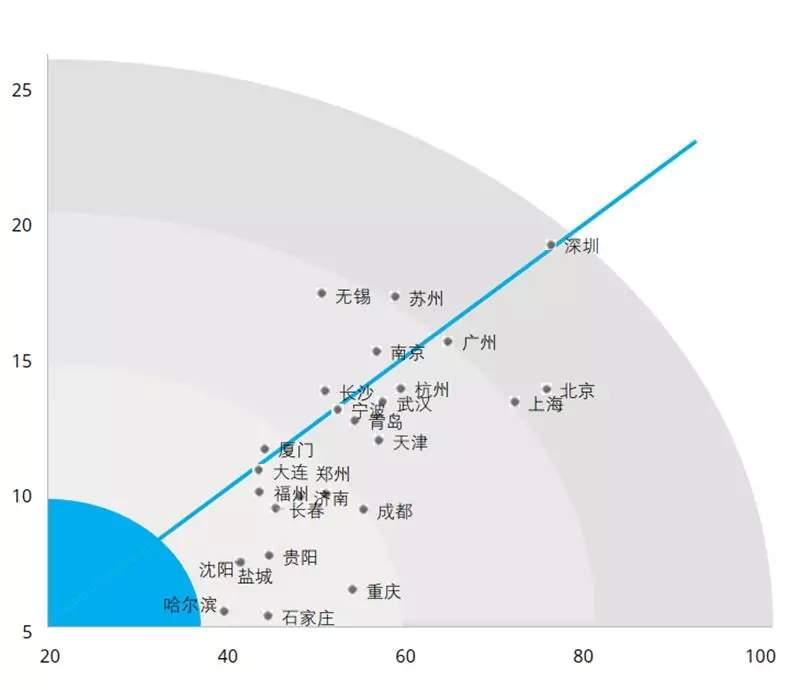 ▲超级智能城市指标得分与地区人均生产总值GDP的关系(万元人民币)(万元)