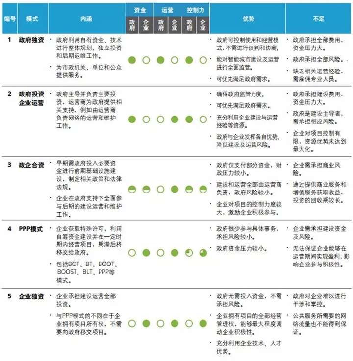 智能城市建设五大运营模式均存在其典型案例, 这些案例将为参与方日后的建设与运营提供借鉴意义。