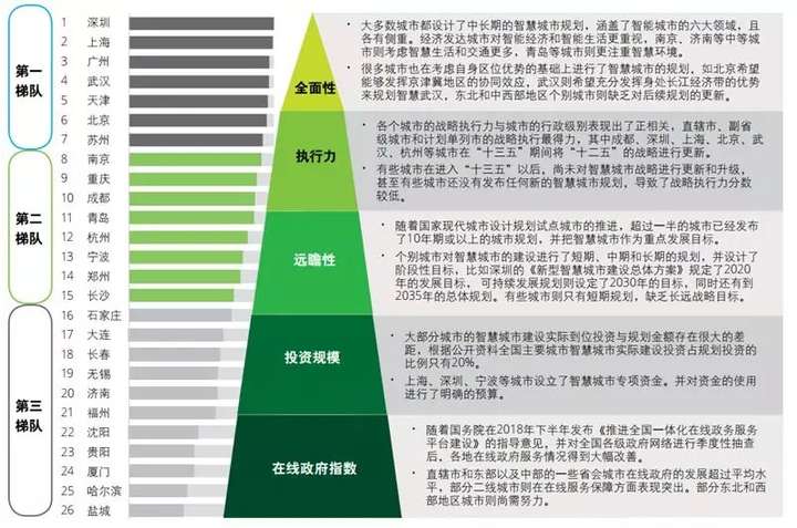 核心的战略层面:城市整体在线政府服务得到改善, 第一梯队城市不仅规划完善, 且政策执行和资金支持均比较到位, 第二梯队城市规划相对比较完善但执行力尚待提高, 第三梯队城市缺少长期和完善的城市规划。