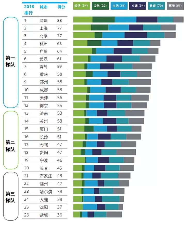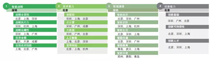 在超级智能城市得分排名中, 4个一线城市表现最好, 在四大核心领域均占领鳌头;13个二线发达城市势均力敌, 其他城市则尚有提升空间。
