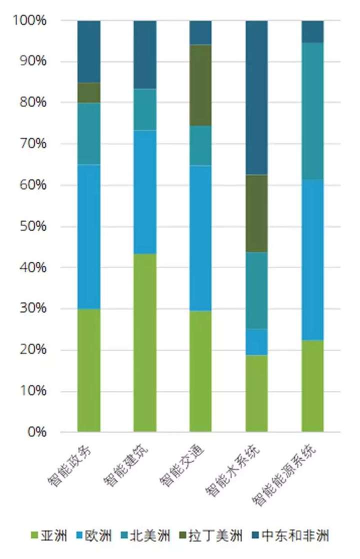 智慧教育在全球智慧城市市场份额占比最大, 预测在2023年仍保持最高的市场份额, 智慧安防增长趋势明显。亚洲地区有较多的智能建筑项目, 水资源相对贫乏的中东和非洲有最多的智能水系统项目。