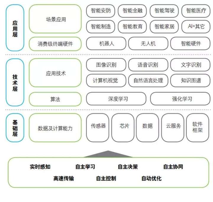 人工智能城市产业链包括基础层加上核心技术层, 然后再加上垂直应用。垂直领域细分为产品和应用智能系统。实时感知、 高速传输、 自主学习、 自主决策、 自主协同、 自动优化、 自主控制。这七大特征是互相关联缺一不可的, 未来超级智能城市需要完全具备这些特征。