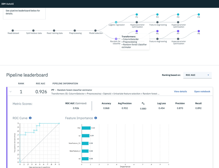 AutoAI的仪表板促进了人机交互,而不是取代人机交互,从而使数据科学家和领域专家能够做出明智的选择并为模型创建做出贡献。在IBM AutoAI系统的以下图形界面中,您可以看到如何构建八个模型(顶部可视化)以及根据所选度量(ROC-AUC)对模型进行排名的排行榜(底部列表)。在数十种算法中,AutoAI选择了逻辑回归和随机森林这两种算法,并为每种算法生成了四个模型。在全部使用逻辑回归算法的四个模型中,模型P2包括一个超参数优化步骤,该步骤将其与P1相区别。模型P3包括特征工程步骤,而P4包括第二个HPO步骤。