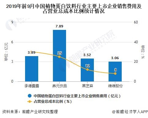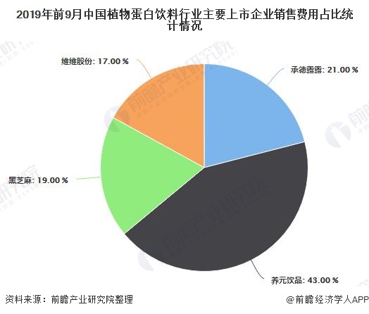 从企业销售费用来看,2019年前三季度,承德露露销售费用达3.89亿元,占营业总成本的30%,是四家上市企业中占比最高的企业;养元饮品销售费用达7.89亿元,占营业总成本的25%;四家上市公司的销售费用对比中,养元饮品销售费用高昂,占比达到43%。
