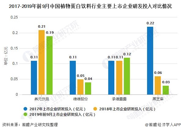 从企业产品研发投入来看, 2017-2019年植物蛋白饮料行业上市公司研发投入中,养元饮品、承德露露研发投入持续上升;2019年前三季度,养元饮品研发投入达0.19亿元约为黑芝麻公司的6倍左右。随着植物蛋白饮料行业市场环境进入“消费者时代”,消费者的需求逐渐多元化,消费心理呈现求新、求变的趋势,新兴品牌或创新型产品层出不穷,只有通过技术赋能,开发多种满足消费者需求的产品才能推动市场规模不断扩大。