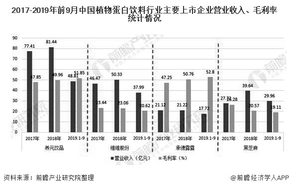 从营收和毛利率来看,2017-2019年,植物蛋白饮料行业主要上市公司近3年毛利率较高,营业收入不断增加。2019年前三季度,养元饮品与承德露露毛利率超50%,领先于业内其他公司。市场规模上,养元饮品具有明显优势,行业地位较为稳固。