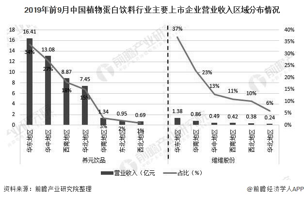 从企业收入区域分布来看,2019年前三季度,养元饮品营业收入主要分布于华东、华中地区;维维股份营业收入则主要分布于华东、华南地区。植物蛋白饮料主要上市公司收入分布具有明显的区域性,这与消费群体不同的饮食习惯,物流运输,植物蛋白饮料生产区域性,植物蛋白饮料本身是典型的原材料导向型等因素有关。