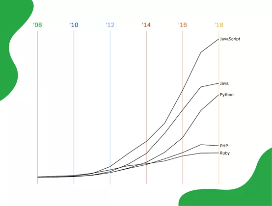 Github每年都会开展一次调研。2018年,来自TheState of the Octoverse的报告向我们展示了近年来Python的使用量是如何上升的。