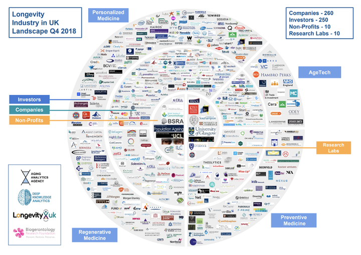 此思维导图概述了英国长寿产业的概况,其中包括260家公司,... [+]老化分析机构