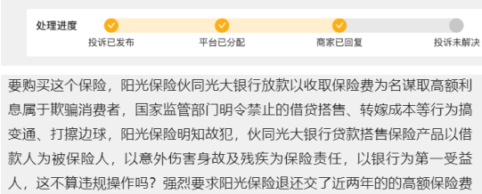 近期,包括谭女士在内的多名用户在聚投诉、黑猫投诉等平台曝光了中国阳光保险靠借贷搭售保险的“套路”。这些用户表示,在阳光保险借款的整个过程中,想要借款成功,必须要购买人身意外险等保险。有用户在放款后才发现实际到账金额已被扣除保费金额,更有有用户称自己并未收到保单,连自己买的是什么保险都无从知晓。