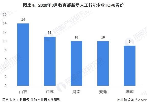 2019年,全国共有35所高校获得首批人工智能专业建设资格。2020年3月,教育部再次审批通过180所高校开设人工智能专业,其中教育部直属高校有15所,此外山东、江苏、河南、安徽、湖南等人口教育大省也新增人工智能专业的院校,旨在加快培养地区人工智能人才,推进地方人工智能的发展。