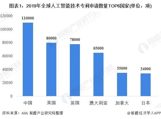 近年来,我国新一代人工智能相关学科发展、理论建模、技术创新、软硬件升级等整体推进,我国人工智能技术得到了快速发展,在全球竞争力也得到了显著的提升。2019年我国人工智能专利申请数量首次超越美国,成为世界第一,专利申请数高达11万项;美国人工智能申请数量约有8万项;英国、澳洲、加拿大和日本均入围全球人工智能技术专利申请数量TOP6国家,与中国申请数量有较大差距。