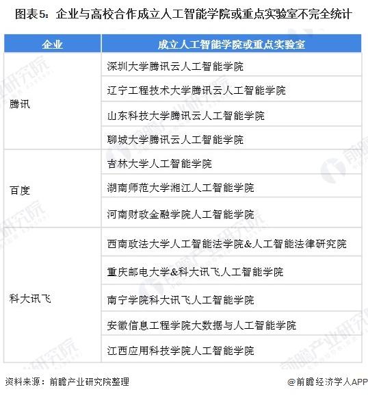 除了国家教育部增设人工智能专业院校外,我国科技巨头与人工智能领先企业也纷纷与国内顶尖高校加强合作,联合成立了人工智能学院或重点实验室。其中,腾讯则与深圳大学、辽宁工程技术大学等院校展开合作,科大讯飞分别与西南政法大学、重庆邮电大学、南宁学院等大学展开合作。