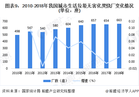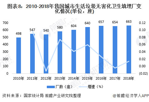 从无害化处理企业来看,2010-2018年,我国城市生活垃圾无害化卫生填埋和焚烧厂数呈逐年增加趋势。2018年,我国城市生活垃圾无害化卫生填埋厂共663座,同比增加9座;无害化城市生活垃圾焚烧场数量为331座,同比增加45座。