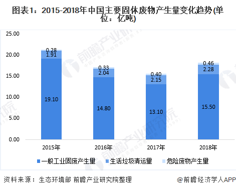 固体废物主要包括生活垃圾、工业固废、危险固体废物等。数据显示,2015-2018年,我国主要固体废弃物中,一般工业固体废弃物产生量最大。2018年,我国大中城市一般固体废物产生量为15.5亿吨,同比增长18.32%。