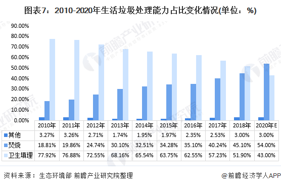 以生活垃圾为例。对生活垃圾的具体处理式有许多种,其中最常见的分别是卫生填埋、焚烧和其他方式。目前,我国以卫生填埋的应用最广,所占收运量的比例也最高;焚烧则通常限定在沿海地区。根据“十三五”规划,到2020年,我国生活垃圾处理方式中,焚烧处理将成为大头,占比将达54%。