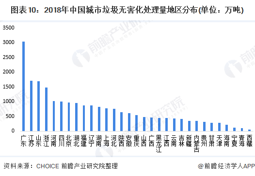 从无害化处理区域分布来看,我国各个区域之间有较大的区别。2018年,北京、上海、江苏、浙江、安徽、湖北、湖南、广西、海南以及重庆等地均已实现生活垃圾全面无害化处理。