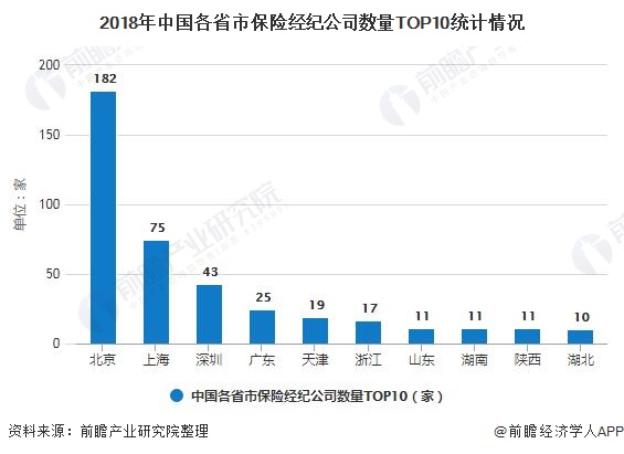 从保险经纪公司的分布来看,北京市的保险经纪公司的数量同样排在全国第一位,数量为182家,遥遥领先与其他省市地区;排在第二位的是上海市,保险经纪公司的数量为75家;深圳市以43家排名第三位。