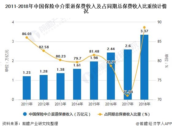 从目前来看,保险中介渠道仍然是销售保险产品的首要渠道。2011年,中国保险中介保费收入占同期全国总保费收入的86%,为近年来最大值;2018年保险中介保费收入占同期全国总保费收入的88.68%,较2017年有所上升。