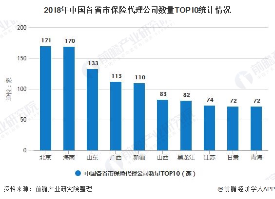 从保险代理公司的分布来看,北京市和海南省均拥有170家,排在全国首位;山东省和广西省保险代理公司的数量分别为133家和113家,排在全国的第二和第三位。