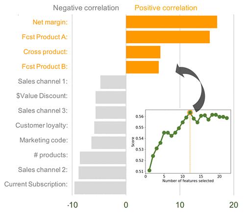 在这12个因素中,净利润率,产品A和产品B的预计购买量以及多个产品客户的指标是最容易引起客户流失的特征。减少客户流失的因素包括三个销售渠道,一个营销活动,折扣价值,总体订购额,客户忠诚度以及购买的产品总数。